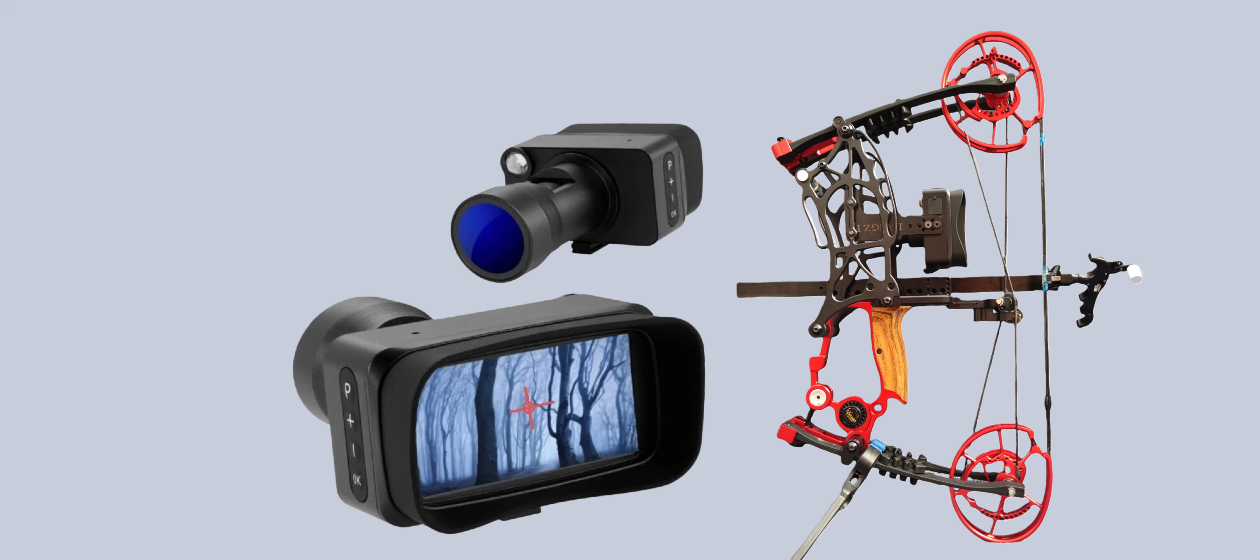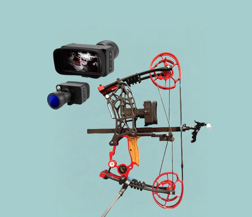 High-performance compound bows equipped with electronic night vision scopes for low-light hunting and tactical shooting.